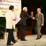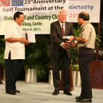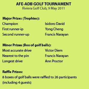 About 200 members and spouses participated in 3 days of celebrations in Manila on 9–11 May to mark AFE’s first 25 years. Although tropical storm Aere (Bebeng) threatened to wash out the events on the first morning, it veered away at the last moment, enabling the celebrations to kick off early that day as planned, with 26 members playing in a golf tournament at the Riviera Golf Club in Silang, Cavite. The tournament was won by Isidoro “Sid” David (see box for the list of winners).