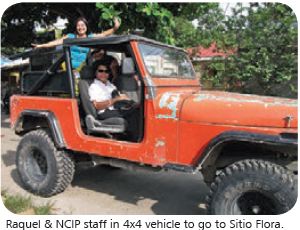 I drove alone to San Fernando, Pampanga, to the NCIP Office and spent the night there. The next day, Marta, Ms. Jones Conception Binwag (a geodetic engineer with NCIP), and I drove to Capas, Tarlac. In Capas, we picked up Juliana Manalili, head of the NCIP Technical Division and implementer of the school project. We brought bags of school supplies for the children and the teachers. In Patling we changed to a 4-wheel-drive vehicle for the journey to Sitio Flora. Gilbert Cuero joined our team. Gilbert was the first EVACF indigenous person scholar and now works with NCIP as a clerk in the NCIP office in Tarlac.